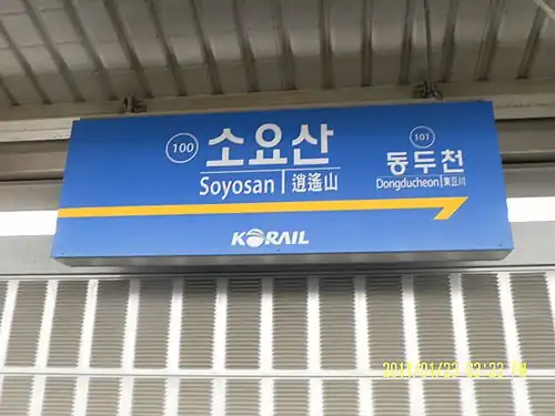Soyosan station (Korean소요산역; Hanja逍遙山驛; RRSoyosan-yeok) is a ground-level metro station on Line 1 of the Seoul Subway in Sangbongam Dong, Dongducheon, South Korea. It is named after the nearby Soyosan (587 m),[3] a mountain beside the U.S. Army base Camp Casey. It is on this mountain, at the Jajae'am Hermitage, that the Buddhist Saint Wonhyo is said to have reached enlightenment.[4]