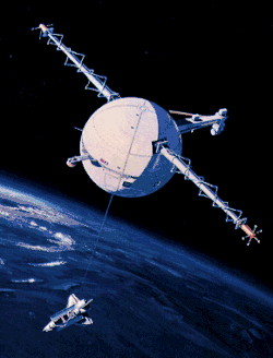 A NASA artist's rendering of a satellite tethered to the space shuttle.