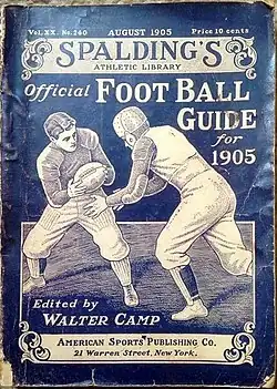 The Official Foot Ball Guide, containing official rules of the game, predated the Spalding Athletic Library, first being issued by Spalding in 1887.[58] This annual publication actually carried forward a series of earlier football guides edited by Hall of Fame coach Walter Camp from 1884 to 1886, published by Wright and Ditson.[58] Camp continued to edit these annual guide books in subsequent years on behalf of Spalding.