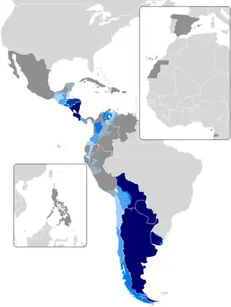 Spanish-speaking areas with yeísmo: pink indicates areas without yeísmo; blue indicates areas with yeísmo.