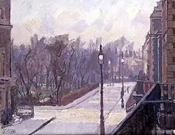 Gore's painting Richmond Park, thought to have been painted in the autumn of 1913 or shortly before the artist's death in March 1914, was exhibited at the Paterson and Carfax Gallery[9] in 1920. In 1939 it was exhibited in Warsaw, Helsinki and Stockholm by the British Council as Group of Trees.[10] It is now in the collection of the Tate Gallery under its original title but is not currently on display.[10] It is not certain where in the park the picture was made but a row of trees close to the pond near Cambrian Gate has a very close resemblance to those in the painting.[11] Another Gore painting, with the same title (Richmond Park), painted in 1914, is at the Ashmolean Museum. His painting Wood in Richmond Park is in the Birmingham Art Gallery's collection.[12]