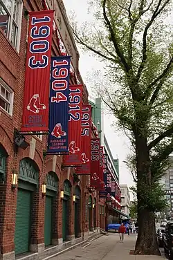 The Boston Red Sox's championship banners at Fenway Park, with banners from the team's dynastic years at the foreground