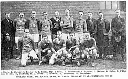 In 1918, Scullin Steel of St. Louis entered a team in the St. Louis Soccer League. The team surged to the top of the league, winning the title only to fall to the bottom the next season. It came back in the 1920-1921 season to take the league title for a second time. That year, Scullin Steel also went to the 1921 National Challenge Cup championship, falling 4-2 to Brooklyn Robins Dry Dock. Scullin Steel repeated as league champion for the 1921-1922 season and won the 1922 National Challenge Cup in a 3-2 victory over Todd Shipyards. While it finished second in the league standings the next season, Scullin Steel went to a third consecutive Challenge Cup final. This time, it forfeited to Paterson F.C. after the first game ended in a 2-2 tie. Scullin Steel chose to return to St. Louis when several players left the team in order to join their professional baseball teams.[1] Scullin finished third in the league standings the next two seasons and in 1925 did not enter the Challenge Cup after the American Soccer League and St. Louis Soccer League chose to boycott it.[2]
