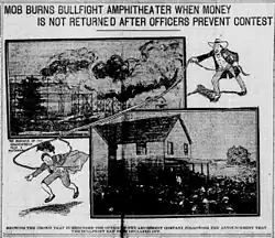 6. ^ a b c "Mob burns bullfight amphitheater when money is not returned after officers prevent contest," The St. Louis Republic. June 6, 1904. pp. 1, 3. Accessed Sept. 10, 2014.