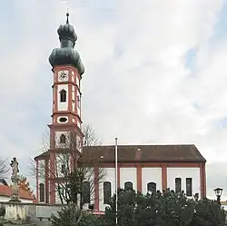The baroque wall pillar church was built between 1706 and 1708. It consists of a five bay nave, a semicircular choir apse on the east side, and a two-story sacristy on the south wall of the choir. The choir flanking tower with a Welscher dome on the north wall of the choir was only added between 1775 and 1779. The bell frames with four bells and the tower clock are built into its upper floors, which are divided by pilasters.