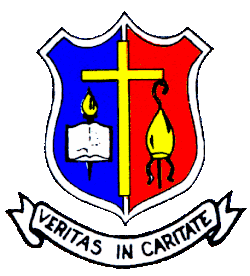 The college crest is shield-shaped in blue and red – the college colours. Depicted on it are: a book to show that its function was to be educational, a torch to represent the devil, a cross to show that it was to be Christian and a bishop's mitre and crozier to show that it was to be diocesan. The motto chosen was "Veritas in Caritate" adapted from Bishop Anthony Wood's own episcopal motto. The text is taken from St Paul's Letter to the Ephesians: "If we live by the truth and in love, we shall grow in all ways into Christ." (Eph 4:15)