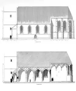 The main entrance to the church is in a small porch on the tower and west wall of the nave with an almost square floor plan, oriented like the tower. The nave is just under 20 meters long and a little over 12 meters wide, including the inset chapels. It is divided into four bays by three buttresses on each long side. The west wall of the nave is the only wall of the nave oriented like the tower and porch; the interior buttresses do not abut the wall of the nave at right angles, but mediate between the two different orientations. There are inset chapels with their own vaults in the spaces between the buttresses.[6]