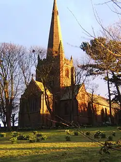 St George's is constructed in red sandstone with ashlar dressings, and has slate roofs.[2][3] Its plan is "markedly asymmetrical",[3] and consists of a four-bay nave with a north aisle, a central tower with a transept to the north, a south vestry, and a chancel.[2] The nave and the aisle have two-light windows on the sides and three-light windows at the east ends. At the west end, the nave has a five-light window, and the aisle a two-light window.[2] All the windows contain Geometrical-type tracery.[3] The tower has gabled angle buttresses, a stair turret to the northeast, two two-light windows on the south side, pairs of louvred two-light bell openings, and an embattled parapet with pinnacles. It is surmounted by an octagonal spire with lucarnes. The chancel has a five-light east window and three-light windows on each side. It is surmounted by a traceried parapet and has a cross on its gable.[2]