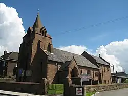 The church is built from local red sandstone with Welsh slate roofs. Its plan consists of an embraced west tower, a four-bay nave with a narrow north aisle, a south porch approached by a flight of steps, and a chancel which is higher than the nave. The organ chamber is to the north of the chancel and underneath the chancel are vestries.[1] It has a "very short, very powerful west tower with short broach spire", with one set of lucarnes.[7] The church has two massive west buttresses and a shallow buttress to the south. On the west side is a two-light window above which is a clock face. On each side are two-light bell openings.[1]