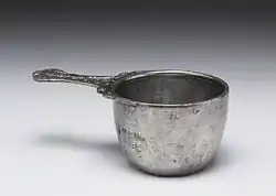It weighs 132.5 g, and is 47 mm high with a maximum diameter of 94 mm, and is 54 mm around the outside of the base.[1] It has been suggested that in addition to its functional role as a cooking or serving vessel it may have been a 'souvenir' of Hadrian's Wall, made for a soldier who had served there. It may have been made as a decorative pan and was then customised by having an inscription added later (using an engraved, rather than relief-cast, inscription as in other enamelled objects of this type).[2]