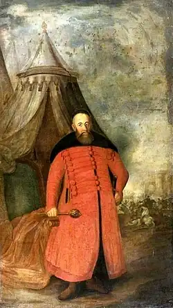 That year Koniecpolski and Żólkiewski led an army to Moldova to protect Gaspar Graziani, an ally of the Commonwealth.[18] The army numbered over 7,000 and included the private regiments of the Korecki, Zasławski, Kazanowski, Kalinowski and Potocki magnates.[19] During the Battle of Cecora (Ţuţora) Koniecpolski commanded the right flank of the Commonwealth forces,[20] which were defeated on 19 September by a combined force belonging to Iskender Pasha and Kantymir (Khan Temir). After retreating in good order, the army's morale fell and while Koniecpolski prevented the army's disintegration on 20–21 September, during the later stages of the retreat its resolve collapsed and the men ran for the river. In the ensuing battle, Żólkiewski was killed and Koniecpolski and many magnates including Samuel Korecki, Mikołaj Struś, Mikołaj Potocki, and Jan and Łukasz Żółkiewski were taken captive.[21] The prisoners were transported to Białograd (Bilhorod), to Iskender Pasha, then to the Castle of Seven Towers at Constantinople, where they were held in the Black Tower. Polish-Ottoman relations stabilized in the wake of the Ottoman defeat at Khotyn in 1621, and in the spring of 1623 the prisoners returned to Poland after a diplomatic mission by Krzysztof Zbaraski purchased their freedom for 30,000 thalers.[4][22]