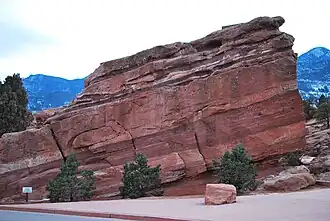 Steamboat Rock is a rock formation in the Garden of the Gods in Colorado Springs, Colorado. It is easily accessible by paved road and is a popular spot for tourist photography. The rock was once privately owned, and tourists climbed upon the rock for photographs of it and nearby Balanced Rock. Climbing upon the rock is now prohibited. While the handrails were removed in the 1970s,[1] the stairs leading up the spine of the formation are still visible.