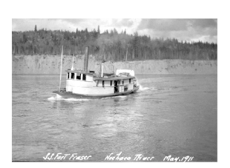 The Nechacco (which would later be renamed the Chilco shown in picture at top of page) joined the Charlotte and the Quesnel in May 1909. She was built by Donald McPhee for the Fort George Lumber and Navigation Company of South Fort George and was piloted by Captain John Bonser, an experienced swiftwater pilot from the Skeena River. The Nechacco would be the first sternwheeler to navigate the treacherous Grand Canyon of the Fraser. The Fort George Lumber and Navigation Company then built the Fort Fraser which pioneered the route to Tête Jaune Cache in 1910 and like the Chilco, she also made several trips on the Nechako River for Frank Swannell that summer. She would also be piloted by Captain Bonser, with Captain George Ritchie taking command of the Chilco for the latter part of the 1910 season of navigation. Unfortunately the Chilco would be lost in April 1911, torn apart in the icy waters of the Fraser near the Cottonwood Canyon. To compete against the BC Express Company's sternwheelers, the Fort George Lumber and Trading Company built a third sternwheeler, again by Donald McPhee in 1910, the Chilcotin. She was piloted by Captain Arthur Frances Dogherty.[1]