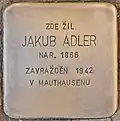 Adler, JakubJakub Adler was born on 26 May 1866 in Velký Bor. His parents were Simon Adler and Rosalia née Treichlinger. He had two sisters, Lotti (born 1867) and Marie (1868–1920). First he married Sofia née Schnürdreher. The couple had two children, Eleanor (born 1890) and Karl (born 1891). His wife died in 1903. Thereafter he married Růžena née Fröhlichová. The couple had at least three sons and two daughters, Josef (also Jozef, born 1904), Anna (born 1906, later named Pisinger), Ota (born 1908), Jindřiška (born 1910) and Jaroslav. He was a merchant, his wives were housewives. He was arrested and deported by the Nazis to Mauthausen concentration camp. He lost his life there in 1942.[2]