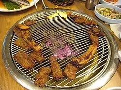 Galbi Galbi is a term which means rib and typically come from pork or chicken. It is a popular dish where the meat is marinated with a mixture of soy sauce, garlic, sugar, and sesame seeds. It is usually placed on a stick since the stick is readily available to dispose and to cook on a grill. Of course, beef galbi can be used to make soup (galbitang) and steamed galbi (galbijjim). But these dishes, while excellent in their own right, are overshadowed by their grilled leader.[17]