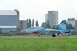 In 1987, Sukhoi started converting the first prototype (designated T10M-1) from a T-10S airframe at its experimental plant in Moscow. Although it had canards, the first prototype, like several subsequent aircraft, lacked the many physical alterations of the new design.[19] It made its first flight after conversion on 28 June 1988, piloted by Oleg Tsoi, followed by the second prototype in January 1989.[20] Following the conversions of the two Su-27M prototypes, the actual production of the aircraft was transferred to the country's Far East where it was carried out by KnAAPO. The third aircraft (T10M-3), which was the first new-built Su-27M and first to be constructed by KnAAPO, made its first flight in April 1992.[20] By then, the Soviet Union had disintegrated, and the ensuing economic crisis in Russia throughout the 1990s meant that the original plan to mass-produce the aircraft between 1996 and 2005 was abandoned,[8] with the aircraft to serve as experimental test-beds to validate the canards, the flight-control system and thrust-vectoring technology.[14] In total, two prototypes, nine flying pre-production and three production aircraft were constructed by 1995;[1][21] the production aircraft were delivered in 1996 to the Russian Air Force for weapons testing.[22]