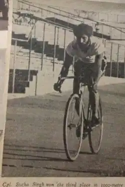 ![]() Sucha Singh Saini riding his bike in 1958 | |