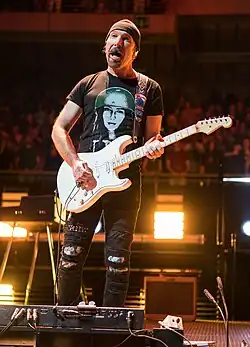 Songs of Experience was released on 1 December on several formats: compact disc, vinyl record, digital download, and streaming.[91] Deluxe editions include up to four bonus tracks.[106] The Extra Deluxe edition contains the album pressed on two 180-gram translucent cyan-coloured vinyl LPs along with a CD copy of the album with four bonus tracks.[107] Also included are a digital download card, a fold-out poster, and a 16-page newspaper-style lyric sheet.[87][107] The album was promoted in several ways upon release. Amazon Music produced online radio programming about the band called The U2 Experience. The content, which was available for the two days prior to the album's release date, included songs from across the band's career, interviews, and live recordings from the Joshua Tree Tour 2017.[108] Spotify produced a mini-documentary about the group called U2 in America that was made available as part of a playlist of their songs,[109] while the band also recorded a "Spotify Singles" session.[92] Apple Music subscribers were given access to an eight-minute video of Bono narrating the album's liner notes.[92] On the day of release, Bono made an appearance on the American football television program Good Morning Football,[110] and the band briefly performed on a sidewalk underneath the High Line in New York City.[111] U2 was the musical guest on the 2 December episode of American comedy television series Saturday Night Live; fellow countryperson Saoirse Ronan hosted the episode.[112] Five days after the album's release, Bono and the Edge rode the Berlin subway line sharing the band's namesake and gave a short performance on a station platform.[113] On 19 December, BBC One aired U2 at the BBC, an hour-long television special that featured performances by the band and interview segments with Cat Deeley.[114]