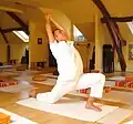 Variant sequences named Chandra Namaskar, the Moon Salutation, are sometimes practised; these were created late in the 20th century.[41] One such sequence consists of the asanas Tadasana, Urdhva Hastasana, Anjaneyasana (sometimes called Half Moon Pose), a kneeling lunge, Adho Mukha Svanasana, Bitilasana, Balasana, kneeling with thighs, body, and arms pointing straight up, Balasana with elbows on ground, hands together in Anjali Mudra behind the head, Urdhva Mukha Svanasana, Adho Mukha Svanasana, Uttanasana, Urdhva Hastasana, Pranamasana, and Tadasana.[42] Other Moon Salutations with different asanas have been published.[41][43][44]