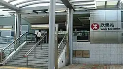 Sunny Bay (Chinese: 欣澳; Cantonese Yale: Yān ou) is an MTR station in Yam O. It is between Tung Chung and Tsing Yi stations. The station is an interchange station between the Tung Chung line and the Disneyland Resort line to Hong Kong Disneyland. The station was originally to be named Yam O (陰澳); however, the name was ultimately replaced, likely because of its linguistically negative connotations[footnote 1].Services to the station commenced on 1 June 2005. The transfer facilities to the Disneyland Resort line opened 2 months later (1 August 2005) that year. The livery of the station is slate grey.