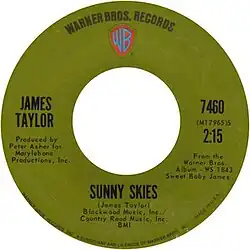 "Sunny Skies" was included on the 1990 version of the compilation album The Best of James Taylor.[5] Taylor wrote the song before being released from his original Apple Records contract, and a demo version of "Sunny Skies" was included as a bonus track of the 2010 CD version of Taylor's first album James Taylor.[1][6] Taylor played the song on 15 May 1980 for the 100th episode of Saturday Night Live.[1]