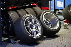 The cars use 18-inch (460 mm) control wheels, produced by Rimstock and supplied by Racer Industries, and control tyres from Dunlop. Supercars are provided with Soft, Supersoft, and Hard slick tyres as well as grooved wet tyres for each event, The requirement to use varying compounds and how many tyres need to be changed per race are dependent on the event.[91]