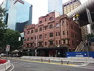 By 1961 the hotel appears to have been in a run down condition and in the need of upgrading to acceptable contemporary standards. Bathroom and toilet accommodation was considered inadequate and the provision of more public spaces to the Sussex Street Bar was considered desirable. At this time the trade of the hotel was mostly from the public bars, and consisted largely of wharf labourers and seamen, but was declining owing to changes in the pick up system for wharf labour and also closure and demolition of adjacent wharves. Physical investigation of the site suggests that upgrading to the hotel did take place in the years after 1961. It was one of the few pubs in Sussex Street to survive the declining trade as the wharves closed.[1][2] In 1970, as part of the adjoining Western Distributor road project, a support pillar for the roadway was built through the hotel building itself.[4]