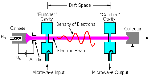 Klystrons share the basic concept that the microwave output is generated by progressively accelerating then slowing electrons in an open space surrounded by a resonant cavity. The easiest klystron designs to understand have two cavities.