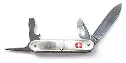 The Swiss Army knife (SAK; German: Schweizer Taschenmesser, Sackmesser, Hegel, etc.) is a pocketknife, generally multi-tooled, now manufactured by Victorinox.[1] The term "Swiss Army knife" was coined by American soldiers after World War II because they had trouble pronouncing the German word "Offiziersmesser", meaning "officer’s knife".[2]