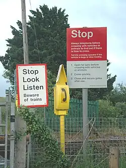 Warning signs and telephone to the signalling control centre on the west side of the crossing