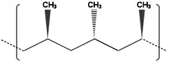 Isotactic polymers are composed of isotactic macromolecules (IUPAC definition).[7] In isotactic macromolecules, all the substituents are located on the same side of the macromolecular backbone. An isotactic macromolecule consists of 100% m diads, though IUPAC also allows the term for macromolecules with at least 95% m diads if that looser usage is explained.[3] Polypropylene formed by Ziegler–Natta catalysis is an example of an isotactic polymer.[8] Isotactic polymers are usually semicrystalline[9] and generally (but not exclusively) crystallize in a helical configuration.[10][11]