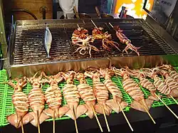 Grilling is an important part of Taiwanese cuisine with many Taiwanese grilling at home and street side grills being a ubiquitous feature of night markets.[30] Rechao (traditional Chinese: 熱炒; simplified Chinese: 热炒; lit. 'hot stir-frying') is a style of Taiwanese cuisine that uses a wok to stir-fry food. Rechao establishments create settings for numerous Taiwanese to connect with each other as they dine and converse.[31][32][33]