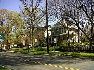 The Takoma Park Historic District is a national historic district in Takoma Park, Montgomery County, Maryland. The district area was platted in 1883 by developer Benjamin Franklin Gilbert, and promoted for its natural environment and healthy setting. An early railroad suburb, the opening of streetcar lines led to the expansion of the district in the early 20th century. Takoma Park houses built between 1883 and 1900 are fanciful, turreted, multi-gabled affairs of Queen Anne architecture with Stick Style and Shingle Style influence. Buildings developed after the turn of the 20th century tend to be one- and two-story brick structures with simple ornamentation, although a few display characteristics of such styles as Art Deco and Tudor Revival.[2]