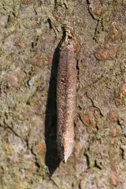 The wings of the male are greyish brown and look frayed, with a wingspan of 15 to 19 millimeters. The females do not have wings, as is usual for bagworm moths.