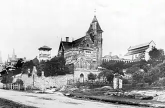 The Abbey was the most outstanding of these homes, an "imaginative, romantic house loosely modelled on a Scottish manor".[4]: p.83 It was designed in a variation of the Victorian Free Gothic style[4]: p.83 and incorporated stencil work, hand-painted panels, timber architraves, a Gothic vault and a tower with gargoyles. Young was the principal builder of St Mary's Cathedral, and it was rumoured that he had stolen gargoyles from the cathedral to use on his Annandale homes. He also used reinforced concrete, quite an innovation at the time.[3]: p.2/35 Young was a Freemason and the house was decorated with Masonic symbols. It was completed in 1882. Young built the home to impress his wife and encourage her to return from England. She did not return and they never lived in it. The Abbey was occupied by housekeepers while Young lived in a house called Kentville, near Rozelle Bay, since demolished. From 1887, the ballroom and stables of The Abbey were used as a boarding house for private schools.[5]