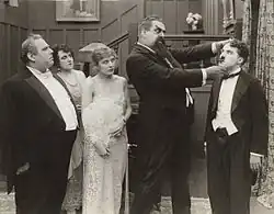 From left to right are Henry Bergman, Marta Golden, Edna Purviance, Eric Campbell and Charlie Chaplin in a scene still from the film