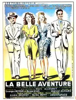 The Beautiful Adventure (French: La Belle aventure) is a 1942 French romantic comedy film directed by Marc Allégret and starring Claude Dauphin, Micheline Presle and Louis Jourdan. It is based on 1913 play of the same name by Gaston Arman de Caillavet, Robert de Flers and Étienne Rey. It was shot at the Victorine Studios in Nice. The film's sets were designed by the art director Paul Bertrand.