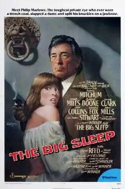 The Big Sleep is a 1978 neo-noir film, the second film version of Raymond Chandler's 1939 novel of the same name. The picture was directed by Michael Winner and stars Robert Mitchum in his second film portrayal of the detective Philip Marlowe (following Farewell, My Lovely three years earlier). The cast includes Sarah Miles, Candy Clark, Joan Collins and Oliver Reed, and features James Stewart as General Sternwood.[2]