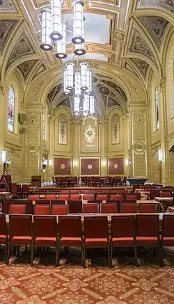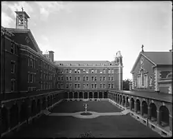 The first dining hall at the CIA was built in 1906 as a chapel; the Jesuits had constructed it as their main chapel to replace smaller chapels in the building.[28] The Jesuits built smaller chapels including altars at each alcove of the hall, and had a pipe organ in front of the main altar off to the left.[29] Upon the CIA's purchase, the chapel was converted into a dining hall, known as Alumni Hall.[28] In 2002, the dining hall was renovated and renamed Farquharson Hall.[8]