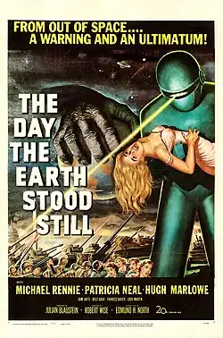 In the first scene of "The Day Tokyo-3 Stood Still", Maya praises the qualities of science with a phrase already used by Anno in his previous anime, Nadia: The Secret of Blue Water.[30][31] The installment reflects the director's epistemology interest, philosophically investigating the qualities or flaws of science and its relationship to man.[32][33] Its title constitutes a reference to the film "The Day the Earth Stood Still" (1951),[34][35][36] reflecting Anno's interest in science fiction.[37] In the course of the episode, cans of the UCC Ueshima Coffee Co. brand —spelled as ICC—[38] are shown,[39] similarly to another earlier work by Anno, Gunbuster.[30][33] The name of the Tokyo-3 election candidate, Nozoku Takahashi,[40][41] is also a reference to a Ghibli studio producer,[42] Nozomu Takahashi.[43][44]