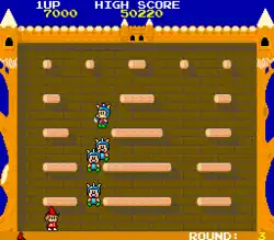 The Fairyland Story is a platform arcade game in which the player takes control the witch Ptolemy through a series of single-screen stages, and the objective is to defeat all of the enemies on each screen. Ptolemy's main weapon is her projectile magic, which will temporarily transform the enemies into large cakes.[1] While in a "caked" form, the enemies can be destroyed either by further magic attacks or by being dropped off a platform, possibly squashing other enemies below.[1] Squashing more than one enemy results in an award of more points and, sometimes, in extra bonuses. 2000 points are awarded for squashing an enemy below a cake, with each additional enemy doubling the number of points awarded.[1] If two or more enemies are killed at once in one spot, a coin will appear in that spot, which may be collected for additional points, and if more are collected, will multiply in points, so as long the player doesn't lose a life.[1]
