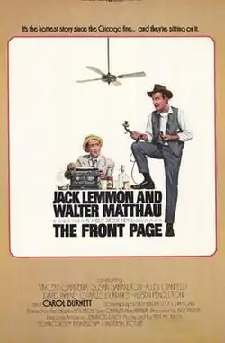 The Front Page is a 1974 American black comedy-drama film directed by Billy Wilder, and starring Jack Lemmon and Walter Matthau.[3] The screenplay by Wilder and I. A. L. Diamond[3] is based on Ben Hecht and Charles MacArthur's 1928 play of the same name (which inspired several other films, such as 1931's The Front Page, the 1940 comedy His Girl Friday and televised movies and series episodes).[4][5][6]