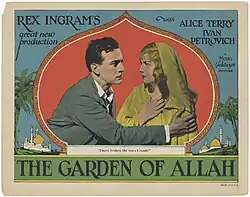 The Garden of Allah is a 1927 American silent romantic drama film directed by Rex Ingram, his final film for Metro-Goldwyn-Mayer. The film stars Ingram’s wife, actress Alice Terry and Iván Petrovich. Due to the public's apathy towards silent films, a sound version was prepared and released in 1928. While the sound version has no audible dialog, it features a synchronized musical score with sound effects. The film was released in both sound-on-disc and sound-on-film formats.