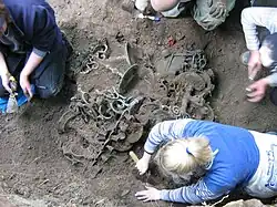 In 2004, archaeological excavations were carried out on the former synagogue site .[3] Approximately 400 objects were found during the works, called the Oświęcim Treasure, comprising the equipment of the synagogue – including chandeliers, copper Ner tamid lamps, fragments of furniture and ornaments, decorative floor tiles, marble elements of the Aron Kodesh, a ceremonial dish for washing hands, charred fragments of prayer books and commemorative plaques.[4] Most items dated from the second half of the 19th century. The discovery was transferred to the Auschwitz Jewish Center in Oświęcim, where the artefacts were catalogued, inventoried and restored. Some items are on display at the permanent exhibition at the Center's Jewish Museum.[5]