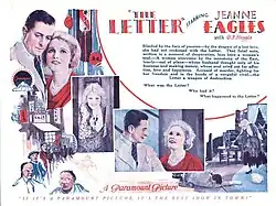 The Letter is a 1929 American pre-Code drama film directed by Jean de Limur and released by Paramount Pictures. It was the first full-sound feature shot at Astoria Studios in Queens, New York City.[1] A silent version of the film was also released.[2] The film stars stage actress Jeanne Eagels in her penultimate role and O.P. Heggie. The film was adapted by Garrett Fort from the 1927 play The Letter by W. Somerset Maugham. The film marks the acting debut of Reginald Owen, who played Robert Crosbie in the film.