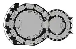The monastery building can be interpreted allegorically to some extent. It has twelve gates,[22] each representing a month, thus creating twelve different climatic zones in the interior and vestibule of the monastery. It is circular and also so large that the number of inhabitants is infinite[23] and a horse could not walk around the monastery in a year. Wolfgang Achnitz used this information to make the following calculation: