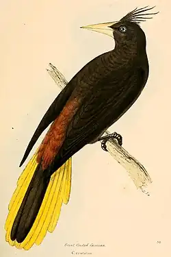 Painting by William Swainson, 1841, of the crested oropendola, "a handsome bird with chestnut and saffron-coloured plumage"[P 49]