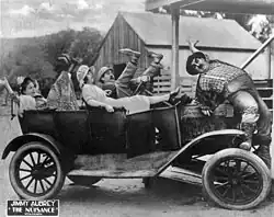 Promotional still with Rosa Gore, Leila McCarthy, Jimmy Aubrey, and Oliver Hardy
