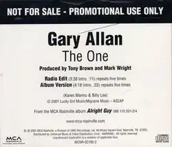 "The One" is a song written by Karen Manno and Billy Lee and recorded by American country music singer Gary Allan. It was released in January 2002 as the second single from album's 2001 album Alright Guy. The song reached number 3 on the U.S. Billboard Hot Country Singles & Tracks chart. It also entered the Top 40 on the Billboard Hot 100, making this Allan's first Top 40 hit on that chart.