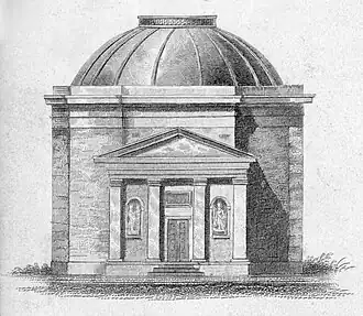 The building was designed on the model of The Pantheon in Rome. It was fifty-six feet (17 m) in diameter, crowned with a thirty-foot (9.1 m) dome.[2] Vanderlyn obtained a nine-year lease for the site from the Common Council for peppercorn rent, with the lot and the building erected upon it to be returned back to the city when the lease expired, although he was given an assurance by Mayor Jacob Radcliff that the lease would be renewed by the Common Council if the Rotunda met "public expectation."[6] Groundbreaking for the building took place in April 1818.[7]